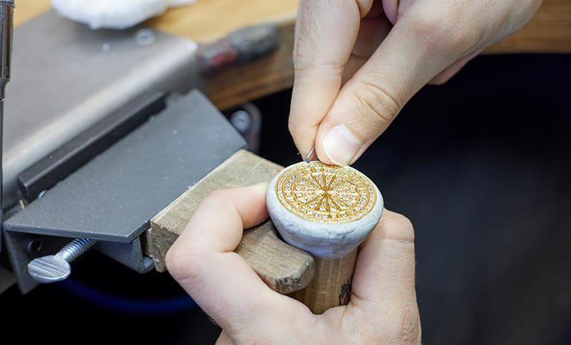 „Mich begeistert es immer wieder aufs Neue, wie viele Fertigungsstufen bis zu den fertigen Trauringen notwendig sind“, berichtet Viviane Helget, neue Head of Marketing im Unternehmen. „Ich komme zwar vom Fach, habe zuvor bei Bucherer und Wempe gearbeitet und kenne daher die Branche gut. Aber diese viele Liebe zu jedem Detail, die dahintersteckt, diese vielen Schritte von grob zu fein, das durchdachte Zusammenspiel von Handwerk und Hightech, das ist schon beeindruckend.“ Tatsächlich erinnern die Prozesse am Anfang eher an einen typischen metallverarbeitenden Betrieb: In der hauseigenen Schmelze wird die Legierung angesetzt, dann werden die Barren zu Blechen gewalzt, und eine riesige Stanze erzeugt mit der Kraft von 100 Tonnen im nächsten Schritt die „Rohlinge“ – Ausgangspunkt für die fugenlosen Trauringe. Fünf modernste CNC-Maschinen fräsen die Ringe auf den Millimeter genau. Es gibt Fasser und Goldschmiede, die die Steine setzen und die Feinarbeiten vornehmen. Ein Laser realisiert individuelle Gravuren. Der letzte Schritt ist die Qualitätskontrolle, bei der unter einem Mikroskop jedes Detail noch mal gegengecheckt wird. So verlassen jedes Jahr circa 195.000 Ringe die Produktion – jeder einzelne genau nach den Vorstellungen der Kunden angefertigt. Eine Manufaktur, die Größe nicht scheut.