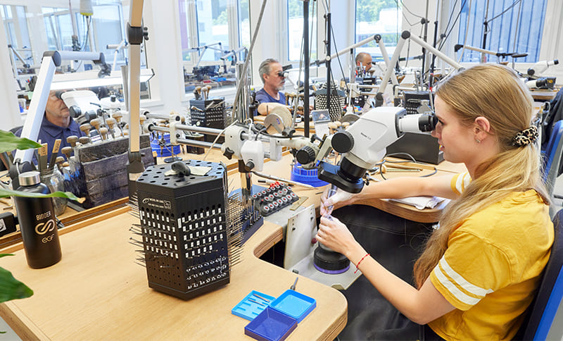 Das moderne Arbeitsumfeld wird höchsten Ansprüchen gerecht, die Übergänge zwischen dem alten und neuen Gebäude sind fließend. Ein Highlight ist der Event- und Pausenraum. „Die Flächen sind flexibel bespielbar“, schwärmt Vertriebsleiter Frank Walz. In einem Raum tagt gerade der Außendienst. Eine flexible Zwischenwand trennt den Raum vom Pausenraum. „Wir wollten hier eine Art Campus-Atmosphäre schaffen“, berichtet der Vertriebsprofi. Das ist gelungen: Kleine Grüppchen finden sich an den variabel zusammenstellbaren Tischen zusammen, eine Kochinsel ist mitten im Raum platziert. Es gibt einen direkten Zugang zu einer weitläufigen Terrasse – hier hat man einen wunderschönen Blick ins Grüne und auf die Innenstadt von Pforzheim. Arbeit, Erholung, Austausch, Miteinander – man merkt den Menschen an, dass sie gerne hierherkommen und die Arbeit bei egf mehr als nur ein Job ist. Während des Manufakturbesuchs findet ein Fotoshooting der Mitarbeitenden im Pausenraum statt. Die Bilder der Teams und Einzelpersonen sollen später noch die weißen Wände schmücken und so zusätzliche Identifikation mit dem Unternehmen stiften. Zudem gibt es eine Hauszeitschrift mit dem Titel „Wir“, die bereits zum zweiten Mal erschienen ist. „In Zeiten des Fachkräftemangels gewinnen weiche Faktoren wie das Arbeitsklima an Bedeutung, um Mitarbeitende zu halten und den Nachwuchs zu gewinnen“, weiß Nick Binder. „Wer sich wohlfühlt, bleibt. Und das merken auch unsere Azubis ganz schnell und die meisten wollen im Betrieb nach dem Abschluss bleiben.“ Zwei Goldschmiede und drei Fasser werden in der modernen Lehrwerkstatt zurzeit ausgebildet, im Herbst kommen fünf weitere Azubis dazu. Insgesamt hat egf 24 Auszubildende und Studenten, die in der Manufaktur lernen. Es wird alles für eine erfolgreiche Zukunft getan.