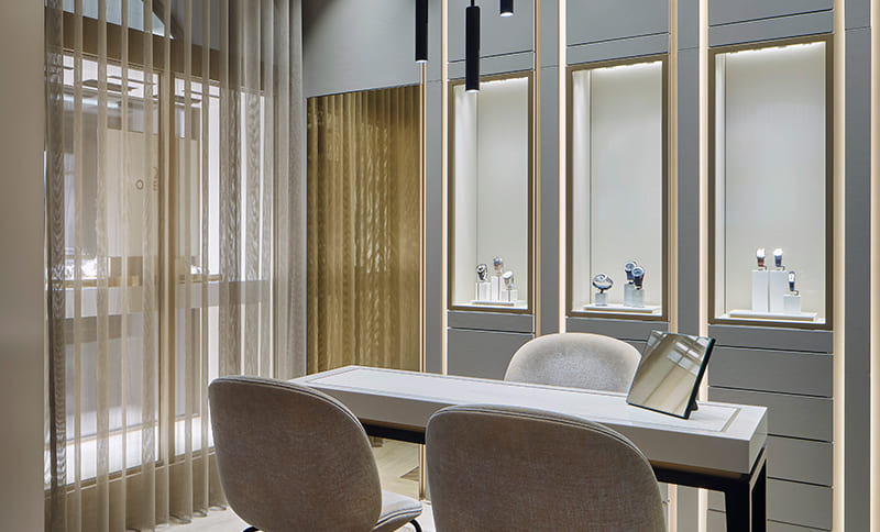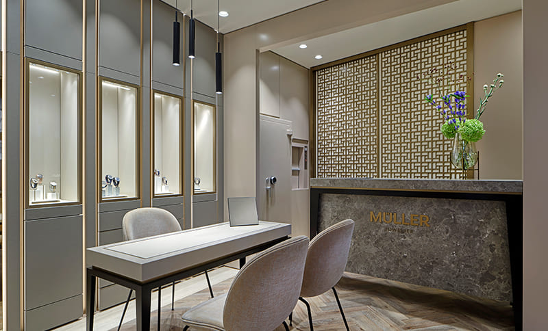 Für Juwelier Müller in Kempten hat eine neue Zeitrechnung begonnen. „Herausforderungen gemeistert!“, so heißt nach der gemeinsamen Begehung der neu geschaffenen Räumlichkeiten das erste Fazit von Juwelier Jürgen Lupfer und Detlef Becker, Geschäftsführer von Heikaus Design Studio, der den Umbau verantwortlich geplant hat. Entstanden ist ein Juweliergeschäft, das in Sachen Individualität Maßstäbe setzt. Organisatorisch besonders ist das Projekt, weil die Bauarbeiten durch die Aufteilung in zwei Bauabschnitte ohne einen einzigen Ruhetag im Geschäftsbetrieb umgesetzt werden konnten. Im nun abgeschlossenen zweiten Bauabschnitt, der rund drei Monate gedauert hat, wurde der 30 Quadratmeter große Uhrenbereich realisiert. Während des ersten Bauabschnitts hatte bereits Top-Marke Rolex einen eigenen Bereich mit eigenen Möbeln erhalten, der nun geschaffene Uhrenbereich wurde einheitlich gestaltet. Durch den Erwerb der ans ehemalige Geschäft angrenzenden Bäckerei konnte die gesamte Verkaufsfläche jetzt auf 120 Quadratmeter ausgebaut werden.