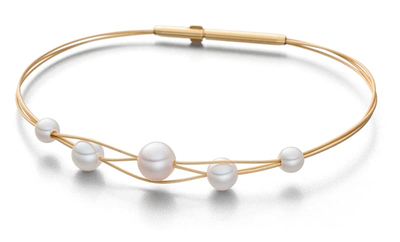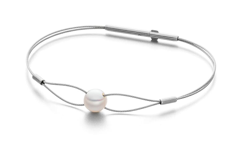 Mit den klassischen Perlohrsteckern fängt die Liebe zu der Perle an“, weiß Eva Strepp. „Perlenstecker sind einfach toll, egal wie groß die Perle ist. Sie passen einfach super zu jedem Anlass und Outfit und sie betonen sehr schön die Augen. Nun registrieren wir eine verstärkte Nachfrage nach Armbändern mit Perlen. Es handelt sich dabei um feine Drahtbändchen mit einem Verschluss. Eigentlich das, was ich persönlich auch am liebsten habe, so ganz unkompliziert anzulegen und zu tragen, eng am Handgelenk anliegend, damit man nirgendwo im Alltag hängen bleibt und das Armband immer perfekt ausgerichtet sitzt.“ Die neuen Armbanddesigns sind eine Idee verspielter, aber ihrer klaren, reduzierten Gestaltung ist Eva Strepp dabei trotzdem treu geblieben. Dabei schafft sie es trotz aller Einfachheit in der Formensprache, sich auf einem schmalen Grat treu zu bleiben, ohne ins Beliebige abzurutschen.