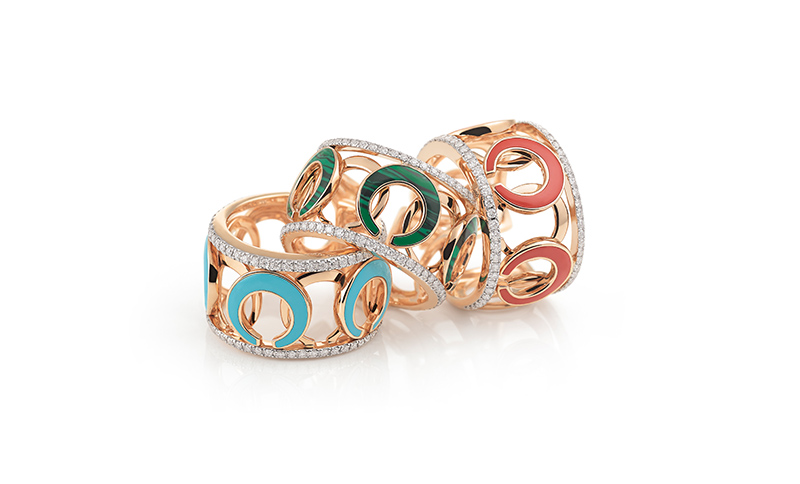 Außergewöhnlich sind die neuen Stücke der Linie „Mezzaluna“ mit Türkis, Malachit und Koralle – ideal für Frauen, die es farbenfroh und romantisch lieben.
