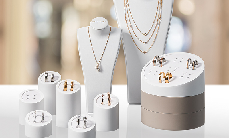 Der Facheinzelhandel erhält auch im Bereich Präsentation Unterstützung. Dahlinger setzt auf lagerhaltige Trauringständer in rundem Design. Darauf lassen sich exquisite Eheringpaare einzeln oder in Gruppen stilvoll inszenieren. Modulare Trauringständer in Weiß und Taupe können beliebig zweifarbig und in diversen Höhen aufgebaut werden. Hier finden bis zu sieben Eheringpaare ihren angemessenen Platz.