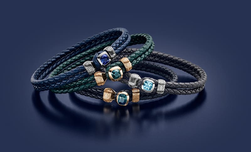 Armbänder der Linie „Exclusive Men“ mit Schließen und Units aus 750 Gold, großen Farbsteinen und geflochtenem Nappaleder