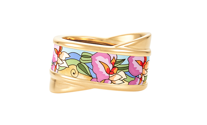 Nicht nur der künstlerische Schaffensprozess, auch die Herstellung der jedes einzelnen Schmuckstücks ist äußerst aufwendig. Insgesamt 80 verschiedene Schritte sind erforderlich, um die Feueremail-Kreationen zum Leben zu erwecken. Die herrlich leuchtenden Farben und der Staub aus 24-karätigem Gelb- oder Weißgold werden hauptsächlich von Hand aufgetragen. Und anschließend wird das Schmuckstück in mehreren Phasen gebrannt, damit es so haltbar ist, dass es jeden Tag getragen werden kann und für immer seine Farbbrillanz behält.