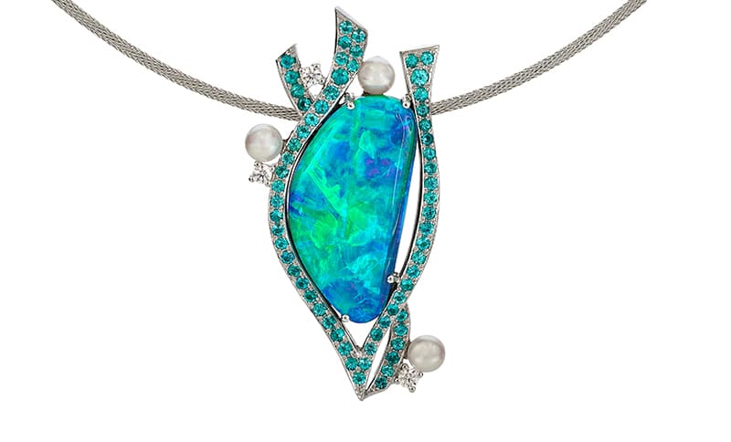 Der Opal vermittelt das tiefe Blau des Atlantiks, türkisfarbenes Wasser von Karibikstränden, das helle Himmelblau tropischer Ozeanregionen – einfach paradiesisch. Dieser außergewöhnlicher Boulder-Opal mit 11,20ct. in türkisblauen Meeresfarben ebenfalls geschaffen von Kreis Jewellery lädt zum Träumen ein. Umspielt mit funkelnden Paraiba-Turmalinen, feinen weißen Akoya-Perlen aus dem japanischen Meer & Diamanten in 750 Weißgold gefasst. Dieser Anhänger spiegelt Australiens schönste Seite.