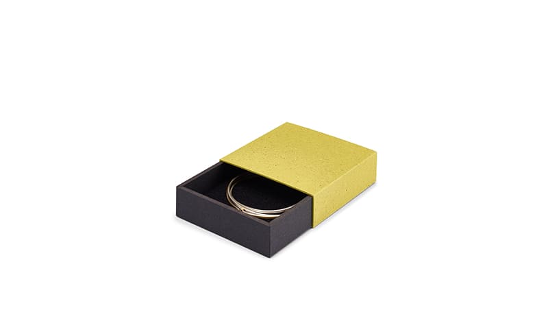 Einen klaren Mehrwert in Design, Farbigkeit und Haptik bietet die „Greenbox“ von Pica Design. Auch hier stehen nachhaltige Materialien im Vordergrund, ihr Name ist Programm: Der Holzkern der zweiteiligen Schiebeschachtel besteht aus umweltverträglich hergestelltem HDF, das beidseitig mit recyceltem Papier bezogen ist. Die Banderole aus Gmund Bio Cycle Graspapier besteht zur Hälfte aus sorgfältig geernteten und getrockneten Gräsern und ist kompostierbar. Das effektvoll leuchtende Grün entsteht durch Zugabe von natürlichem Chlorophyll. Einlagen aus Wollfilz vervollständigen das Produkt. Die klare Formensprache dieser Serie eignet sich bestens für modernen Schmuck mit hohem Anspruch an Design und Nachhaltigkeit.
