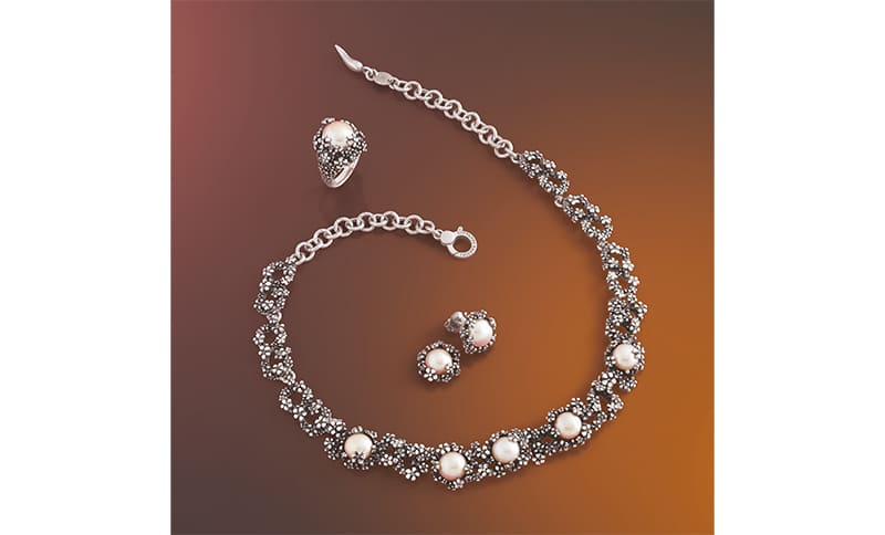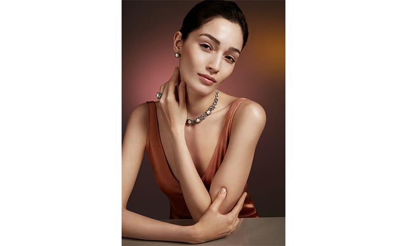 Die Kollektion "Blossom", eine florale Neuheit, setzt auf die Anziehungskraft von Süßwasserperlen in zarten Rosatönen, deren Leuchtkraft durch die diamantgeschliffenen Elemente, die sie umschließen, noch verstärkt wird. Die Kollektion umfasst eine Halskette, eine Chanel-Halskette, einen Anhänger, Armbänder, Ringe und ein Paar Ohrringe.