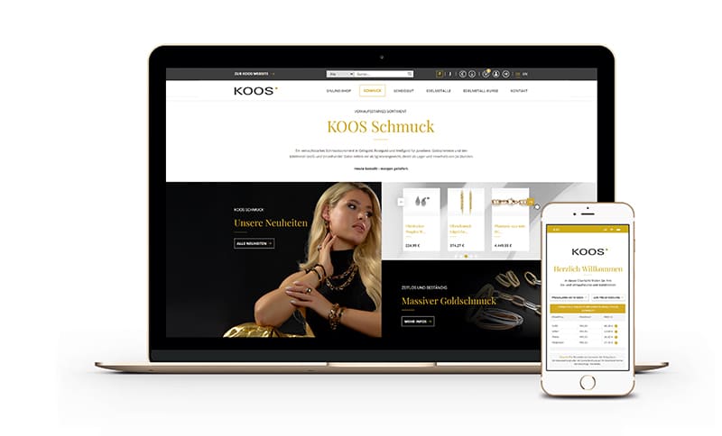 Der Außendienst kann in den Räumen des Juweliers einen weiteren optimalen Vor-Ort- Service bieten. Man braucht nur einen Termin mit dem Koos Außendienst für Scheidgut-Services oder Schmuck-Vorlagen vereinbaren. Das Koos Kundenportal bietet zahlreiche Funktionen und Vorteile und ist rund um die Uhr erreichbar – exklusiv und maßgeschneidert für Juweliere, Goldschmiede und den Edelmetall-Groß- und -Einzelhandel. Online von Montag bis Samstag jeweils von 8 bis 18 Uhr kann man Edelmetalle handeln und bei einer Online-Preisfixierung einen Vorteil von 1 Cent je Gramm Feingold erhalten. Dies ermöglicht eine effiziente und profitable Verwertung der Edelmetalle bei attraktiven Konditionen sowie günstigen Einkaufspreisen bei den Goldschmuckprodukten.