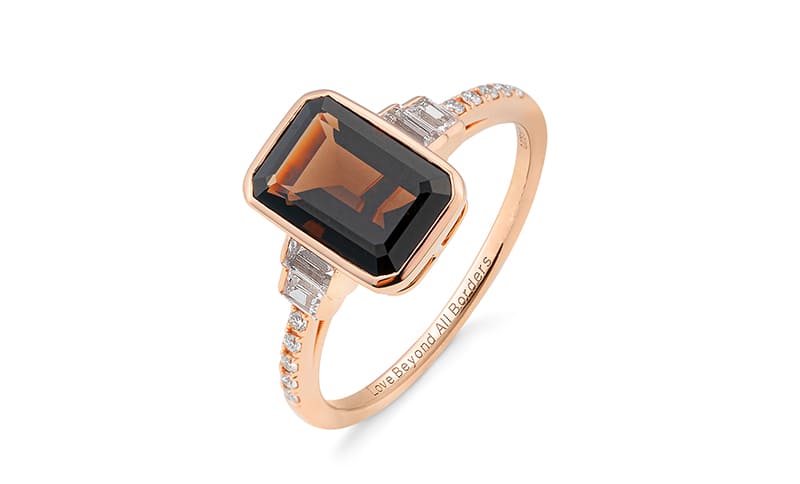 Ein Beispiel ist ein Ring, bei dem der Rauchquarz als Solitär in 585 Rotgold gefasst ist, eingerahmt wird er von Diamanten im Baguetteschliff sowie Brillanten auf der Ringschiene. Das Ringprofil dockt direkt an das Trauringprofil an. Eine einzigartige Symbiose, die es garantiert kein zweites Mal gibt.