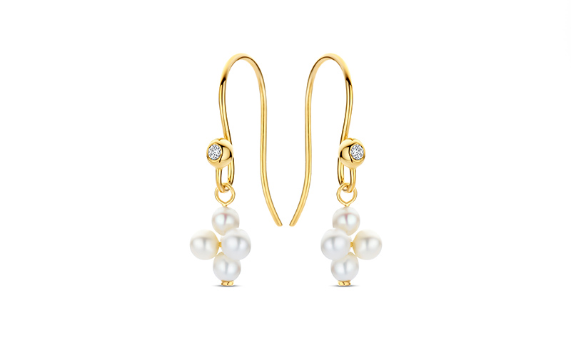 Das kalifornische Surferpara dies und Heimat vieler Stars stand Pate für den Namen der neuesten Kollektion von Spirit Icons: Malibu. Die Stücke – hier zu sehen: Ohrhänger und Ring – verbinden die Aura des Ozeans in Form von Süßwasserperlen mit auffälligen Glanzpunkten, die Zirkonia setzen. Die Kollektion ist in gleich vier verschiedenen Farben verfügbar (weiß, gelb, rosé und schwarz).