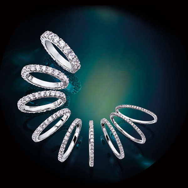 Die Diamond Group hat das größte Angebot an Solitaire-Schmuck am Markt: über 117 verschiedene Ringmodelle in fünf Legierungen – von 585 bis 750 Gold in allen Farben bis hin zu 950 Platin – in sieben Steinqualitäten. Das sind insgesamt 4095 verschiedene Schmuckstücke am Lager. Hinzu kommen die vorrätigen Ringgrößen von 48 bis 60. Auch bei Ohrschmuck mit 33 Modellen kommt man auf 1055 Ohrstecker und mit 43 Colliers ergeben sich 1505 Varianten. Das alles ist sofort lieferbar.