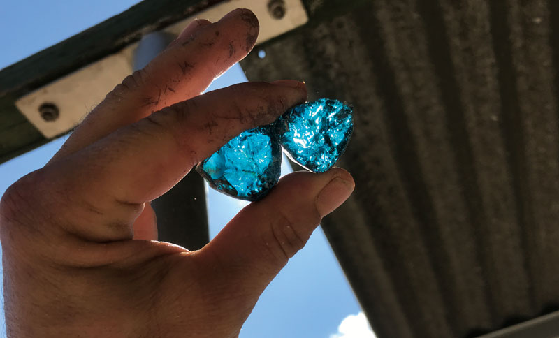 Das Ergebnis waren zwei außergewöhnliche, große Indigolithe in strahlend leuchtendem Blau. „Ihre Leuchtkraft war wirklich faszinierend, so was findet man echt selten“, ist Alexandre Hahn überzeugt. Die Rohsteine wurden in den Ateliers von Gerhard Hahn von Meistern ihres Fachs geschliffen. „Leider ist ein Edelstein geplatzt, das ist immer das Risiko bei der Edelsteinbearbeitung. Dafür ist der andere Stein umso spektakulärer und einzigartiger.“