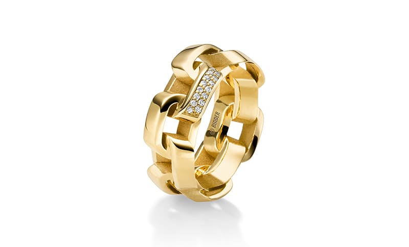 Es gibt zunächst vier Kollektionen. Das Highlight ist „Perception“. Die Linie spielt mit der Wahrnehmung des Betrachters. Auf den ersten Blick verrät die ausdrucksstarke 3D-Optik die genaue Kettenform nicht – betrachtet man die Details beim Anlegen der Kette aus verschiedenen Perspektiven, kann man das Schmuckstück neu erleben.