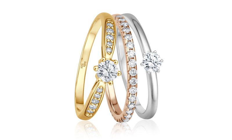 Ausgefeilte Solitaire-Sets ergänzen die Verlobungsringe. Sie gibt es auch als Box-Angebot (Einstiegspakete) mit Backcard. Sie ermöglichen ein Zusatzgeschäft mit Ohrschmuck und Colliers. Auch hier sind drei Fassarten in vier Steingrößen und Preislagen erhältlich. „Solitaire Plus“ arbeitet mit zusätzlichem Brillantbesatz, bei den Steingrößen gibt es nach oben keine Grenzen. Darüber hinaus kann der Juwelier durch seine Steinqualitäten und eigene Punze seinen Namen als Marke herausstellen.