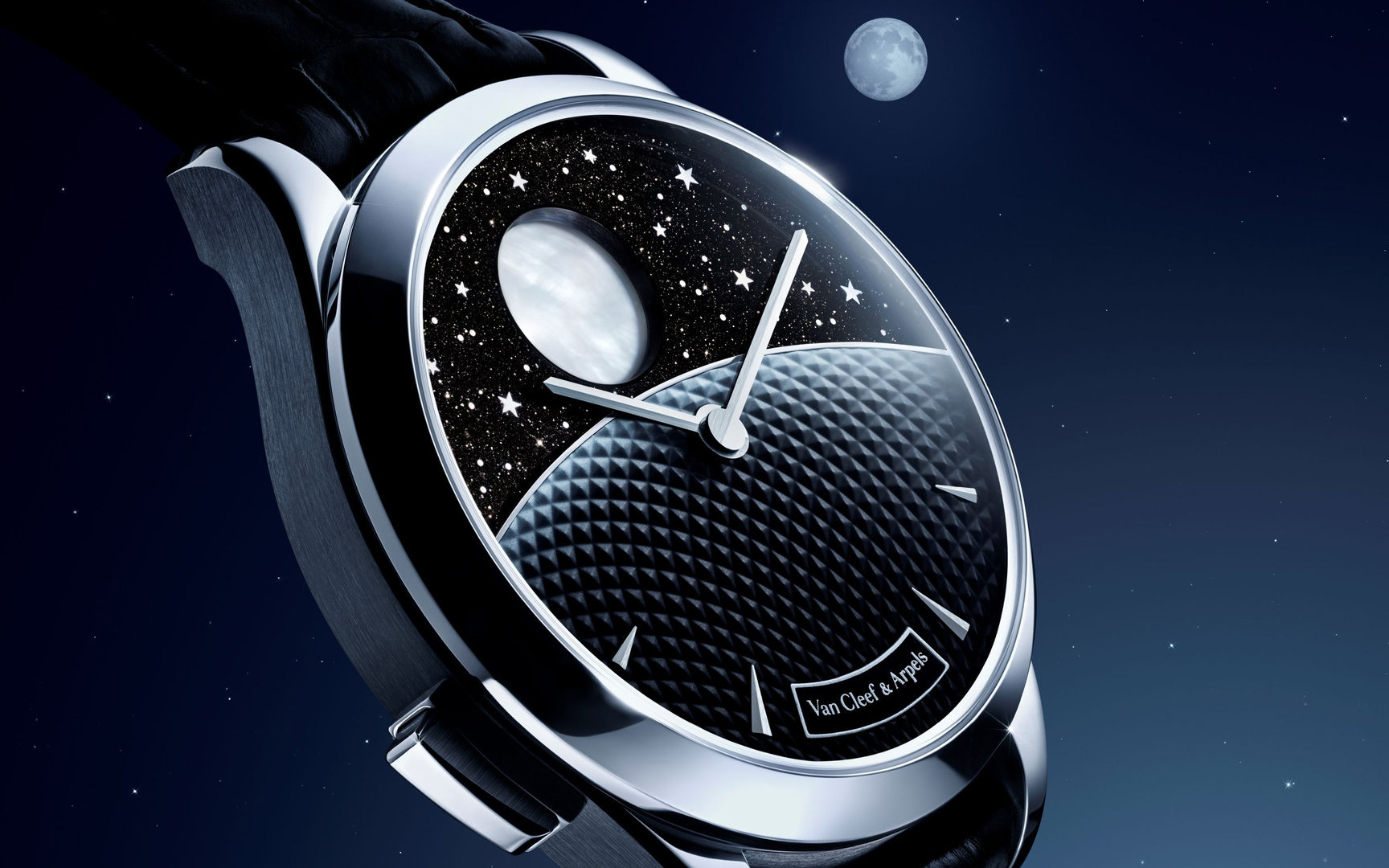 Die Bezeichnung „Midnight“ steht für das charakteristische runde Gehäuseformat, das mit seinem dunklen Aventuringlas-Zifferblatt die Assoziation zur Mitternacht trägt. Die Poetic Complications – ein Begriff, den Van Cleef & Arpels für seine technisch aufwendigen, narrativ geführten Uhren geprägt hat – verbinden in diesem Modell Uhrmacherkunst, Materialkunde und bildende Kunst zu einem Gesamtkunstwerk.