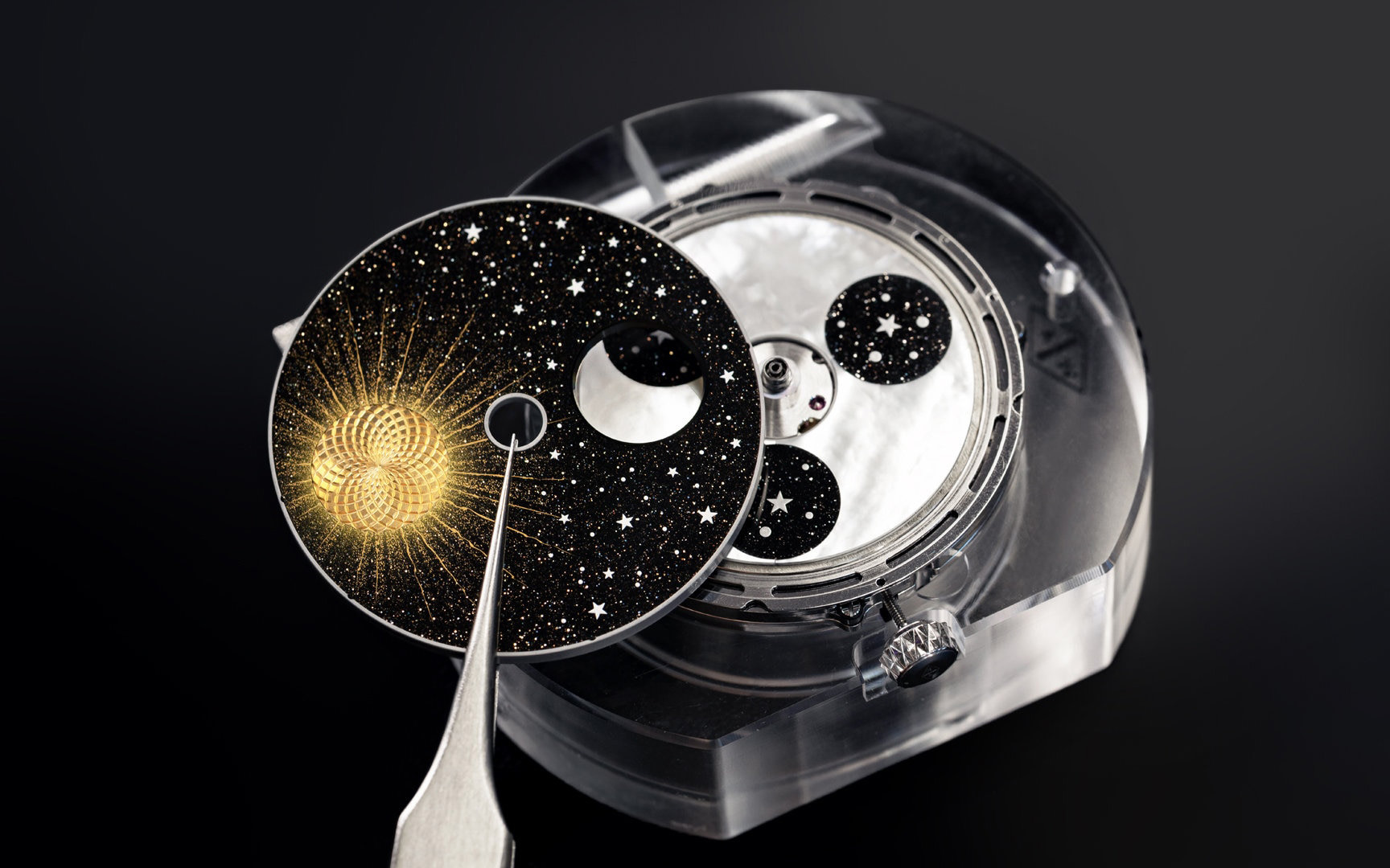 Auf dieser kosmischen Bühne bewegen sich zwei Figuren. Erstens: Eine erste Scheibe rotiert im 24-Stunden-Zyklus und lässt am Tag eine guillochierte Sonne in Gelbgold aufsteigen – ihre ausgearbeiteten Strahlen und goldenen Einschlüsse verleihen ihr Wärme und Tiefe. Mit dem Einbruch der Nacht schiebt sich ein Mond aus weißem Perlmutt ins Bild, begleitet von zarten weißen Sternen in Acryl.