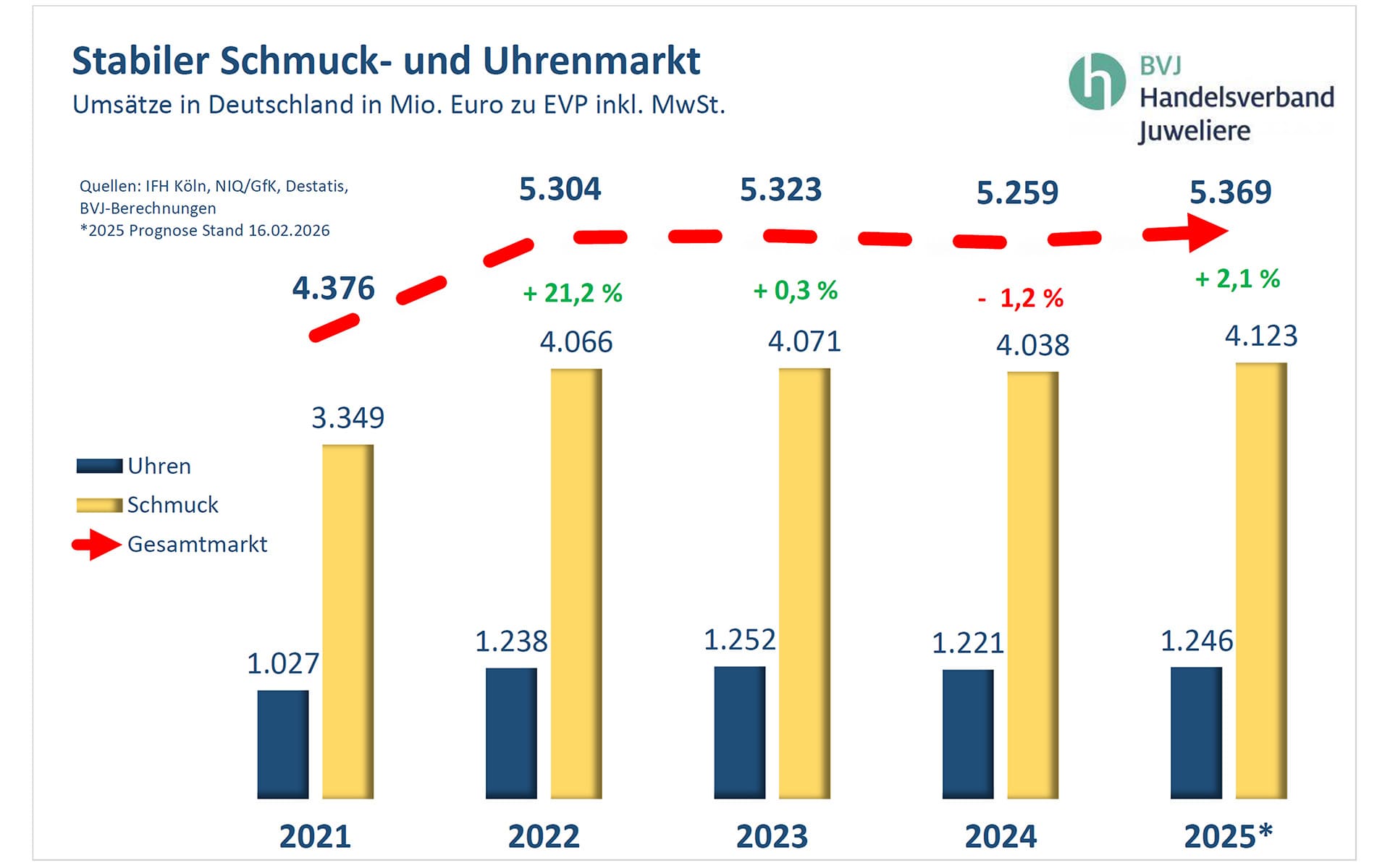 Insgesamt setzte der Handel in Deutschland mit Uhren und Schmuck 5,37 Milliarden Euro um – ein Plus von 2,1 Prozent gegenüber dem Vorjahr, berichtet Stephan Lindner, Präsident des Handelsverbandes, auf der heutigen Eröffnungs-Pressekonferenz. Sowohl Schmuck als auch Uhren legten jeweils um 2,1 Prozent zu. Das Marktvolumen für Schmuck stieg auf 4,12 Milliarden Euro, Uhren erreichten 1,25 Milliarden Euro. Zwar gingen die Stückzahlen zurück, doch höhere Durchschnittspreise überkompensierten diesen Effekt deutlich. „Der Umsatz mit Schmuck und Uhren entwickelt sich konstant und auf einem sehr hohen Niveau“, betont Lindner.