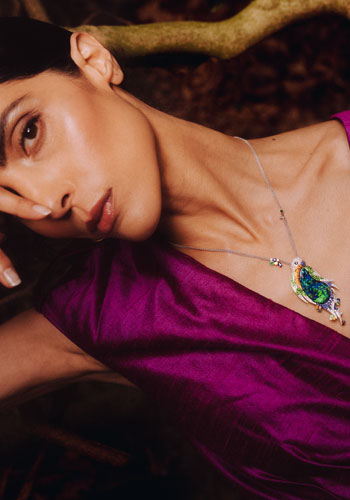 Colour up your life: Die älteste und bedeutendste Opalschleiferei der Welt feiert die Schönheit der Natur mit diesem Papageien-Anhänger mit einem großen Schwarzopal, umrahmt von Brillanten, Saphiren und Tsavoriten.