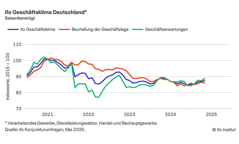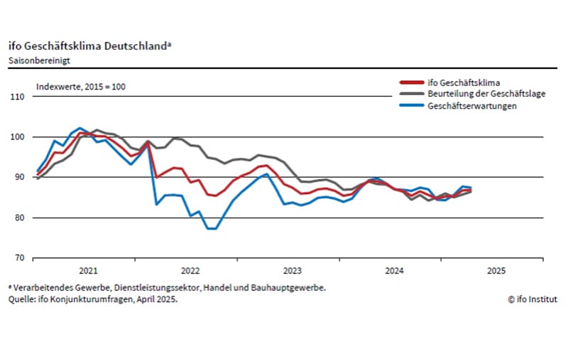 Die Stimmung der Unternehmen in Deutschland hat sich leicht verbessert. Der ifo Geschäftsklimaindex stieg im April auf 86,9 Punkte, nach 86,7 Punkten im März.