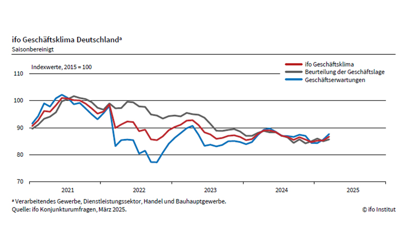 Die Stimmung der Unternehmen in Deutschland hat sich aufgehellt. Der ifo Geschäftsklimaindex stieg im März auf 86,7 Punkte, nach 85,3 Punkten im Februar.
