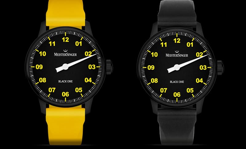 Diese Uhr bringt den MeisterSinger-Grundgedanken der Reduktion nochmals auf die Spitze. Die limitierte Edition „Black one“ ist ein Modell in der Nicht-Farbe Schwarz, kombiniert mit leuchtendem Gelb.