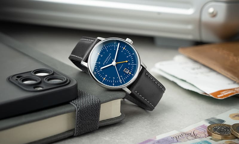 Die Hamburger Marke Sternglas spendiert seiner Bauhaus-Uhr eine zweite Zeitzone. Zum Start gibt es zwei Ausführungen mit diversen Armbandoptionen.