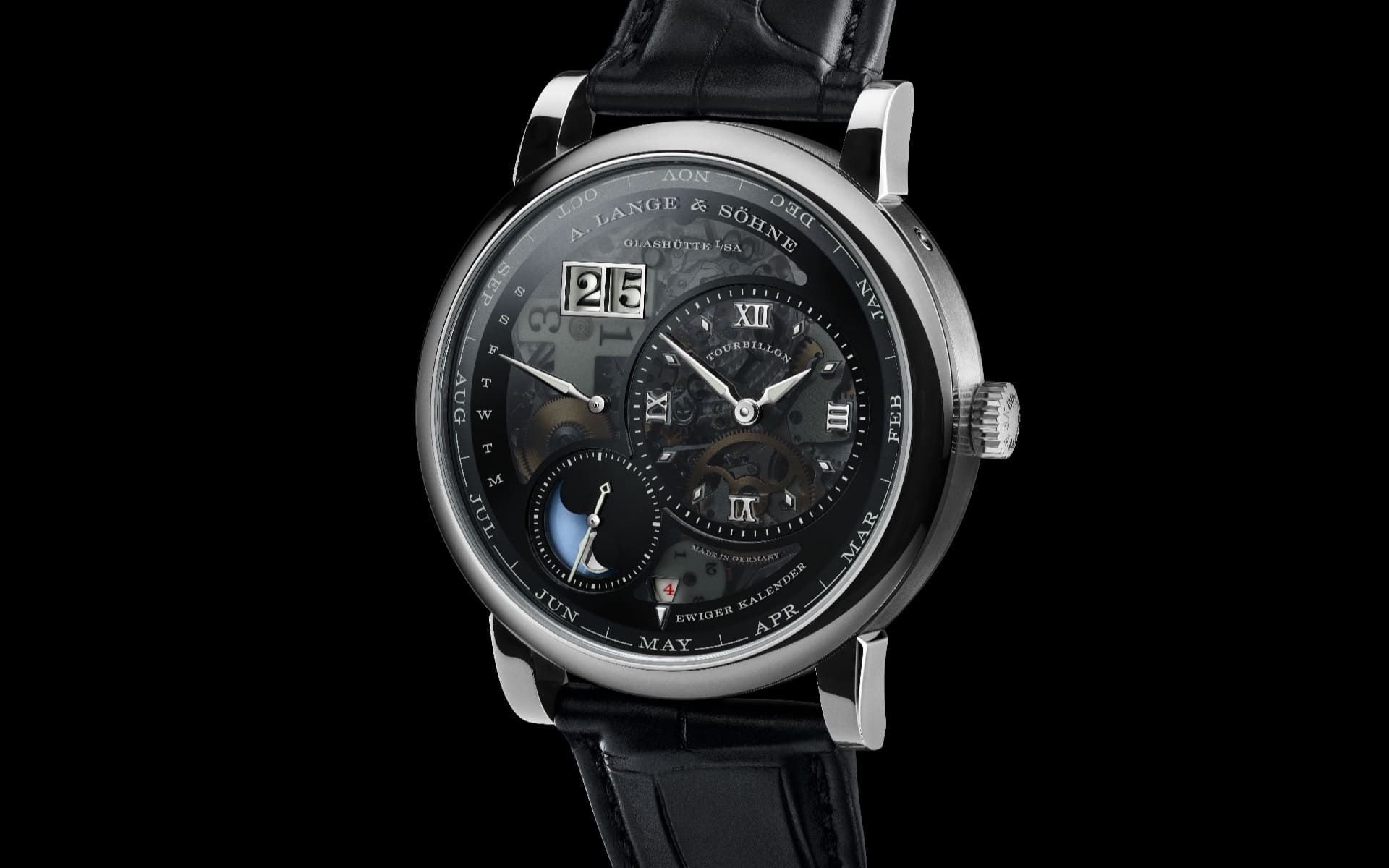 Das 41,9 Millimeter große Gehäuse aus Platin unterstreicht den exklusiven Anspruch der Uhr. In Kombination mit dem dunklen Zifferblatt und einem schwarzen Alligatorlederband entsteht ein kontrastreiches Erscheinungsbild, das technische Raffinesse und gestalterische Klarheit verbindet.