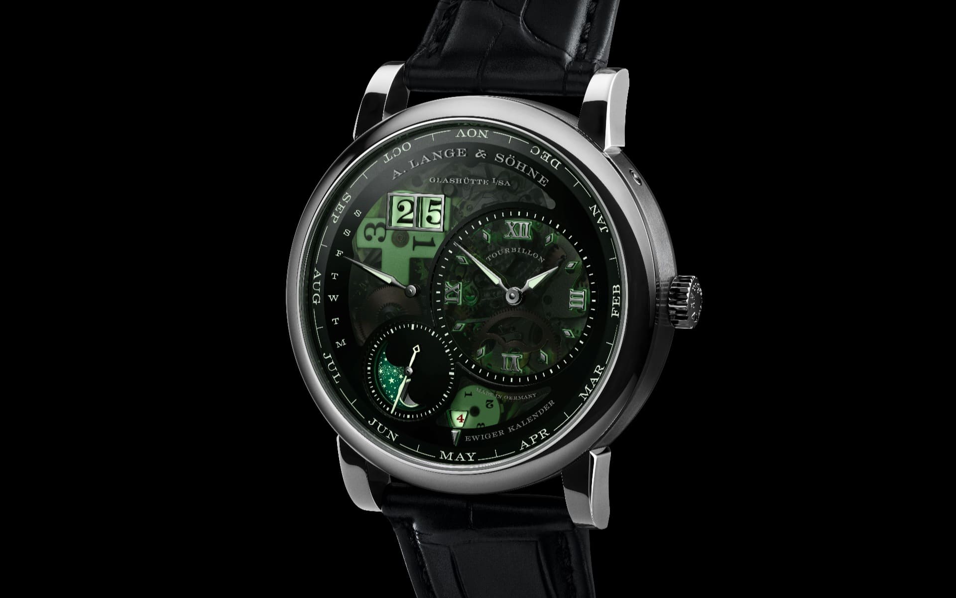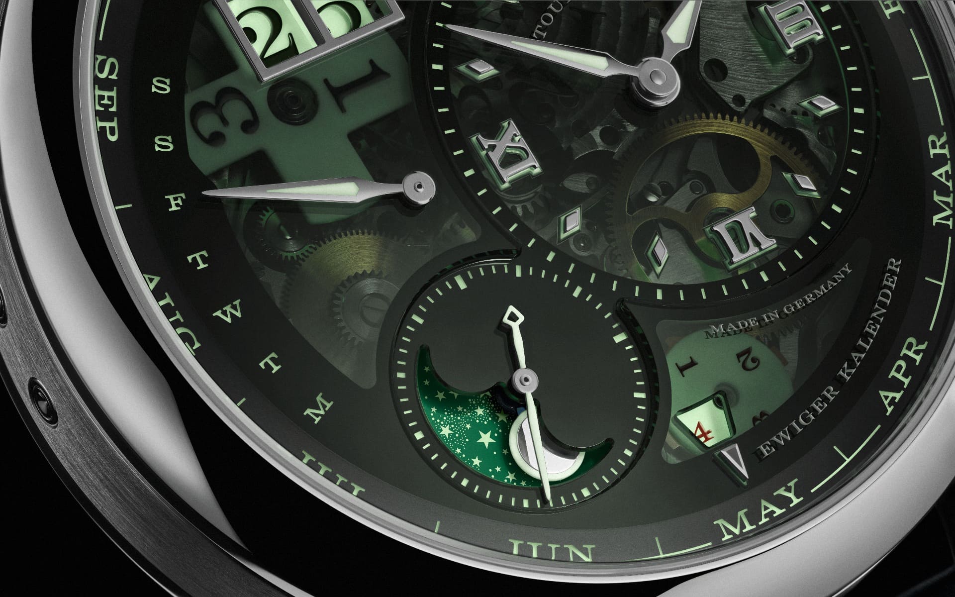 Besonderes Augenmerk gilt dem „Lumen“-Konzept: Ein teiltransparentes Saphirglaszifferblatt lässt energiereiches UV-Licht eindringen, das die darunterliegenden Leuchtstoffe kontinuierlich auflädt. So entsteht ein intensives Nachleuchten aller Anzeigen von der Großdatumsanzeige bis zur Mondphase, die erstmals ebenfalls mit integrierter Tag-/Nachtanzeige und Leuchtfunktion ausgestattet ist. Die Abweichung der Mondphasenanzeige beträgt dabei nach Herstellerangaben lediglich einen Tag in 122,6 Jahren.