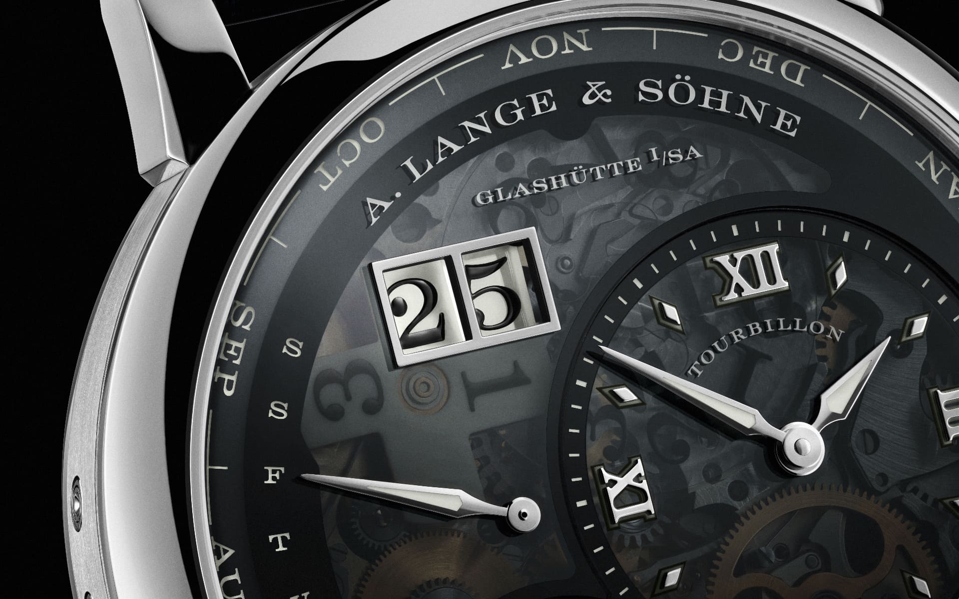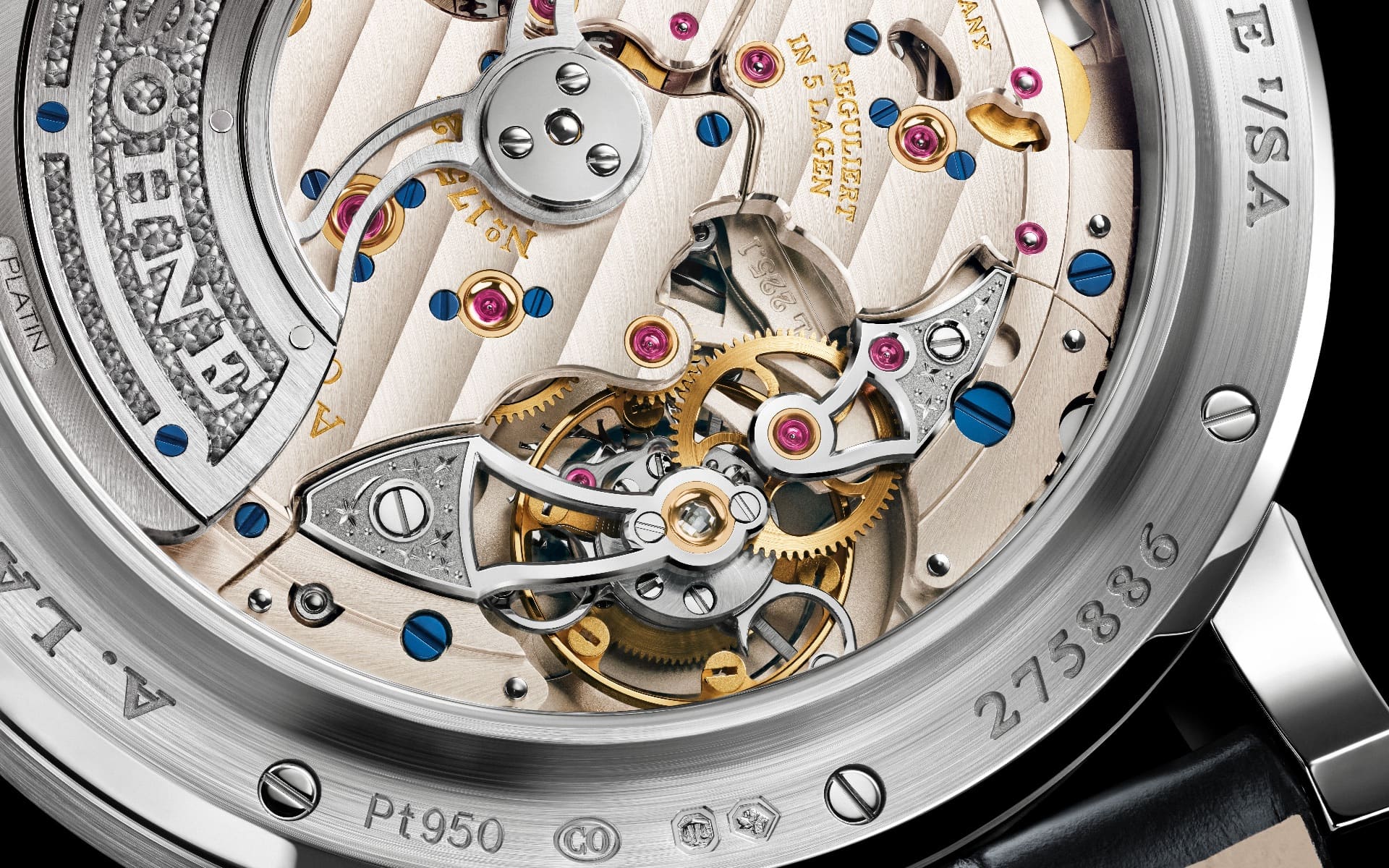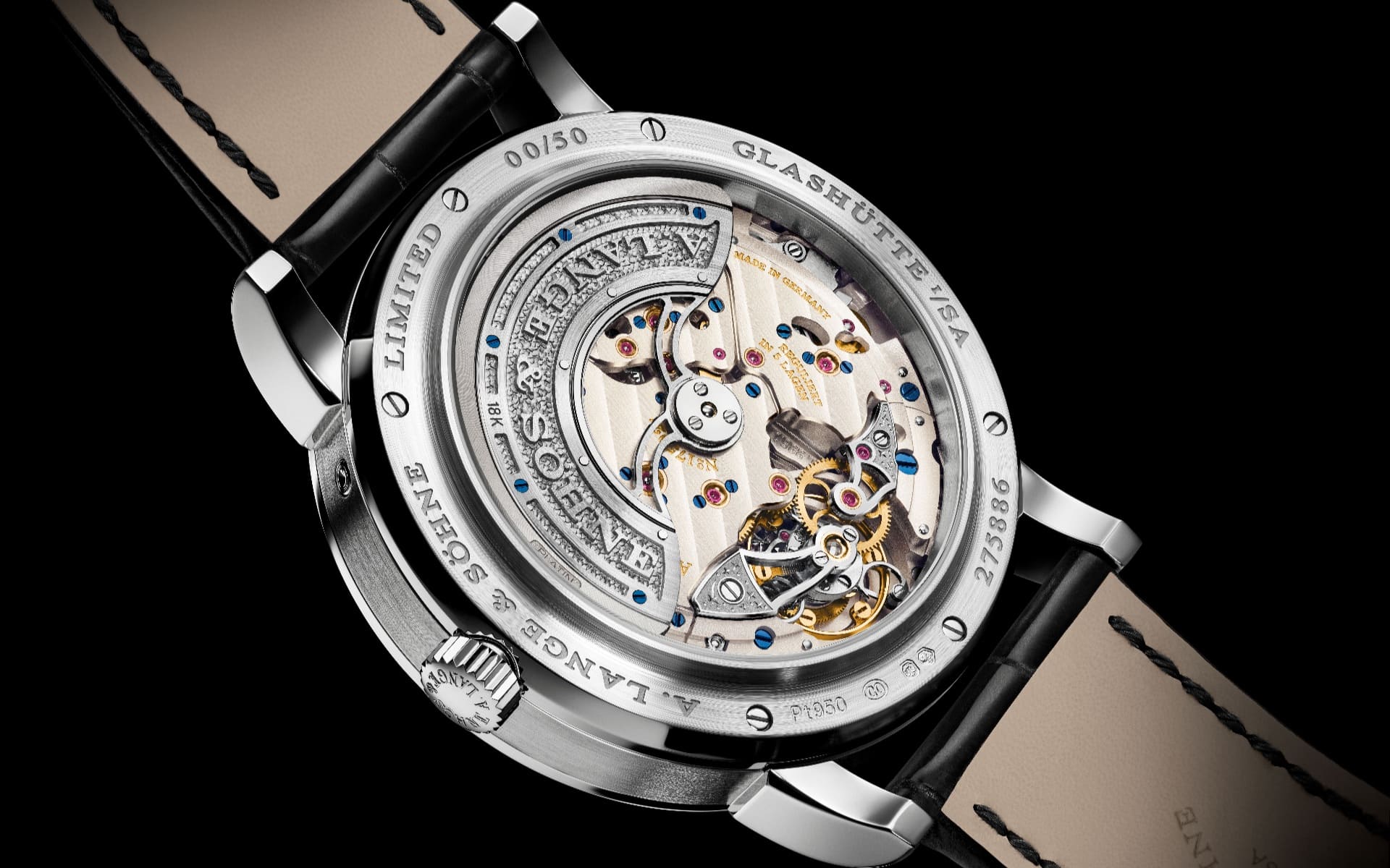 Das aufwendig finissierte Werk offenbart sich sowohl durch das Zifferblatt als auch durch den Saphirglasboden. Typisch für Lange sind handgravierte Kloben, schwarz polierte Stahlteile und fein dekorierte Oberflächen. Ein zentraler Rotor aus 18-karätigem Weißgold mit Platin-Schwungmasse sorgt für effizienten Aufzug.