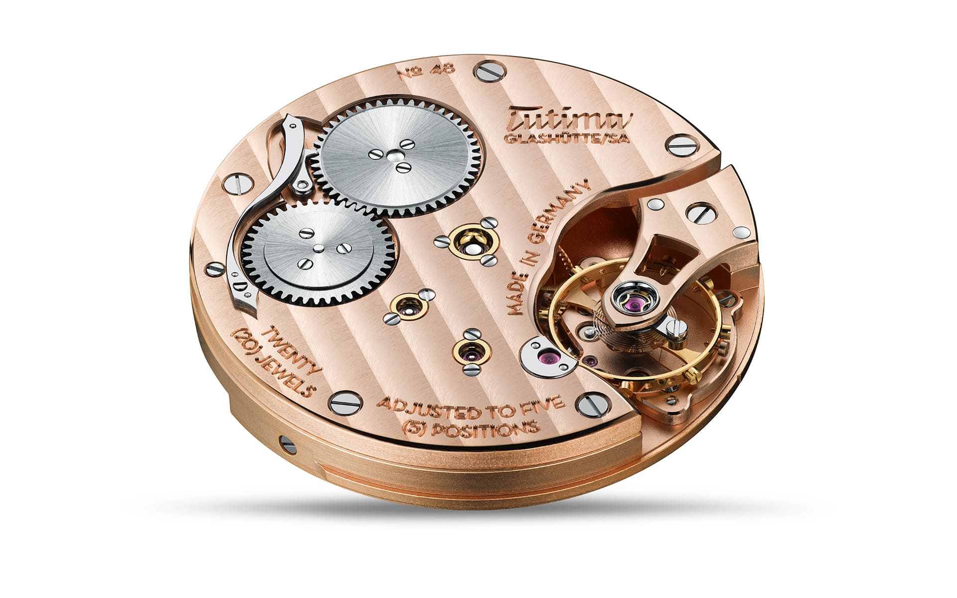 Im Inneren arbeitet das Manufakturkaliber Tutima 617, ein Handaufzugswerk mit feinster Finissierung: Dreiviertelplatine mit Streifenschliff, von Hand anglierte Kanten, Rubinlager in Goldchatons und ein durchbrochener Unruhkloben, der den Blick auf das rückerlose Schwingsystem mit eigens gebogener Breguet-Spirale freigibt. Die Gangreserve liegt bei 65 Stunden.