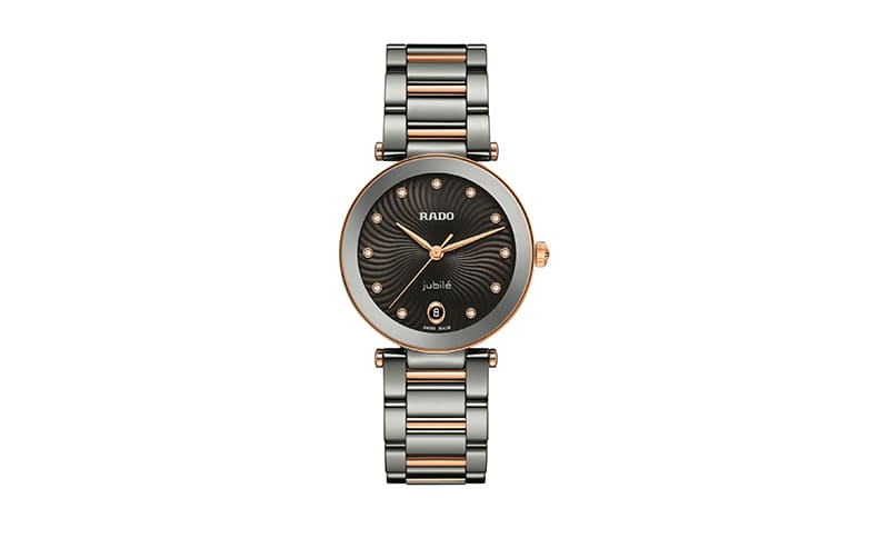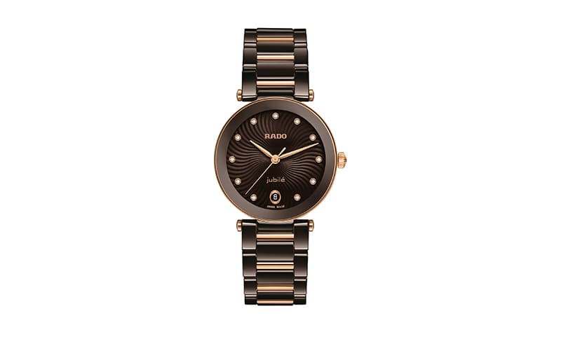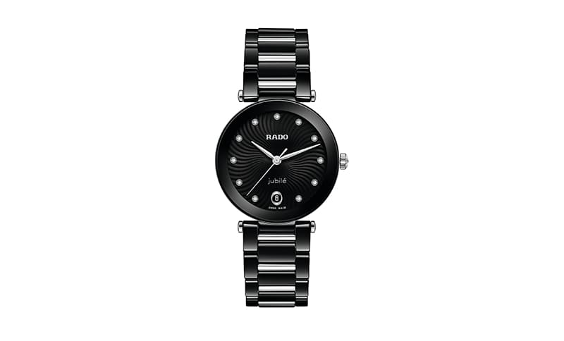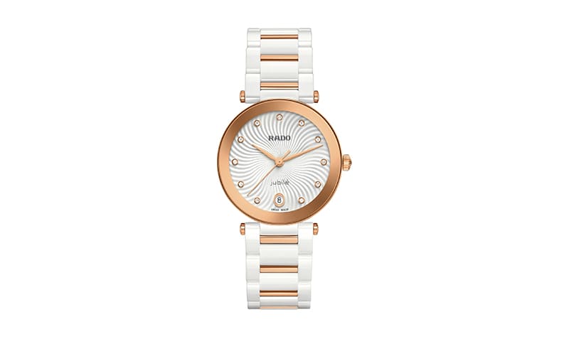 Gehäuse und Armband sind aus leichter, kratzfester Hightech-Keramik gefertigt. Elf Diamantindizes, ein wellenförmig lackiertes Zifferblatt und ein Datumsfenster bei 6 Uhr lassen die Grenzen zwischen Uhr und Schmuckstück verschwimmen. Zum Start der Neuinterpretation des Klassikers lanciert Rado vier Zifferblattvarianten: Schwarz mit Edelstahlakzenten, Plasma-Keramik in Grau mit Roségold, warmes Braun mit Roségold sowie Weiß mit Roségold. Jede Version ist wasserdicht bis 5 bar und misst 31 Millimeter im Durchmesser.
