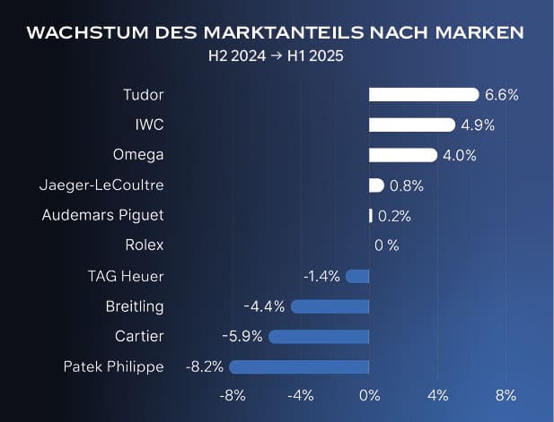 Auch bei Patek Philippe und Audemars Piguet normalisiert sich die Lage. Nach extremen Preissprüngen während der COVID-Jahre konzentriert sich der Markt nun wieder auf ernsthafte Sammler. Der viel diskutierte Rückgang von Pateks Marktanteil um 8,2 % im Vergleich zum zweiten Halbjahr 2024 wird relativiert durch ein besonders starkes Vorhalbjahr.
