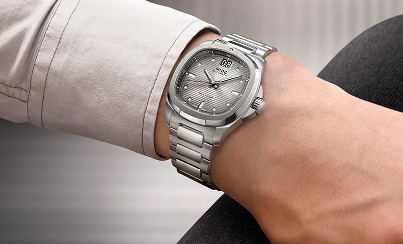 Mido lanciert eine neue Variante der Multifort TV Big Date mit Titan-Gehäuse. Silbergraue Nuancen runden das Erscheinungsbild der Neuheit ab.