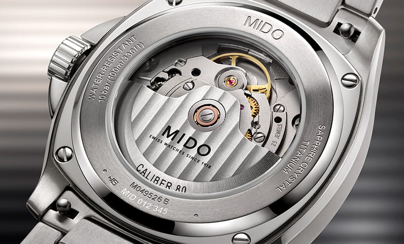 Im Innern arbeitet das Automatikwerk Mido Kaliber 80 auf Basis des ETA C07.651 mit bis zu 80 Stunden Gangreserve und einer Nivachron-Spiralfeder, die besonders widerstandsfähig gegenüber Magnetfeldern und Temperaturschwankungen ist. Die Uhr ist bis 10 bar (100 m) wasserdicht.