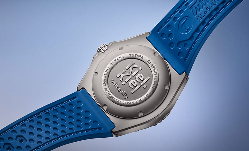 Die neue Sonderedition ist passend zur Kieler Woche gestaltet und „meistert den Umgang mit Wind, Wasser und Wellen“, wie Tutima Glashütte in Bezug auf die Features der Uhr schreibt. Ihr Gehäuse misst 44-Millimeter im Durchmesser und ist aus perlgestrahltem Reintitan, einem Material das laut der Marke ungefähr 40 Prozent leichter als Stahl ist und die gleiche Festigkeit aufweist. Das Zifferblatt ist thematisch passend in Tiefblau gehalten und wer die Uhr wendet, erblickt auf der Rückseite von der Editionsgravur „Kiel.Sailing.City“ mitsamt der Limitierungsnummer und dem Logo der Stadt Kiel. Die Sonderedition ist auf 100 Exemplare limitiert.
