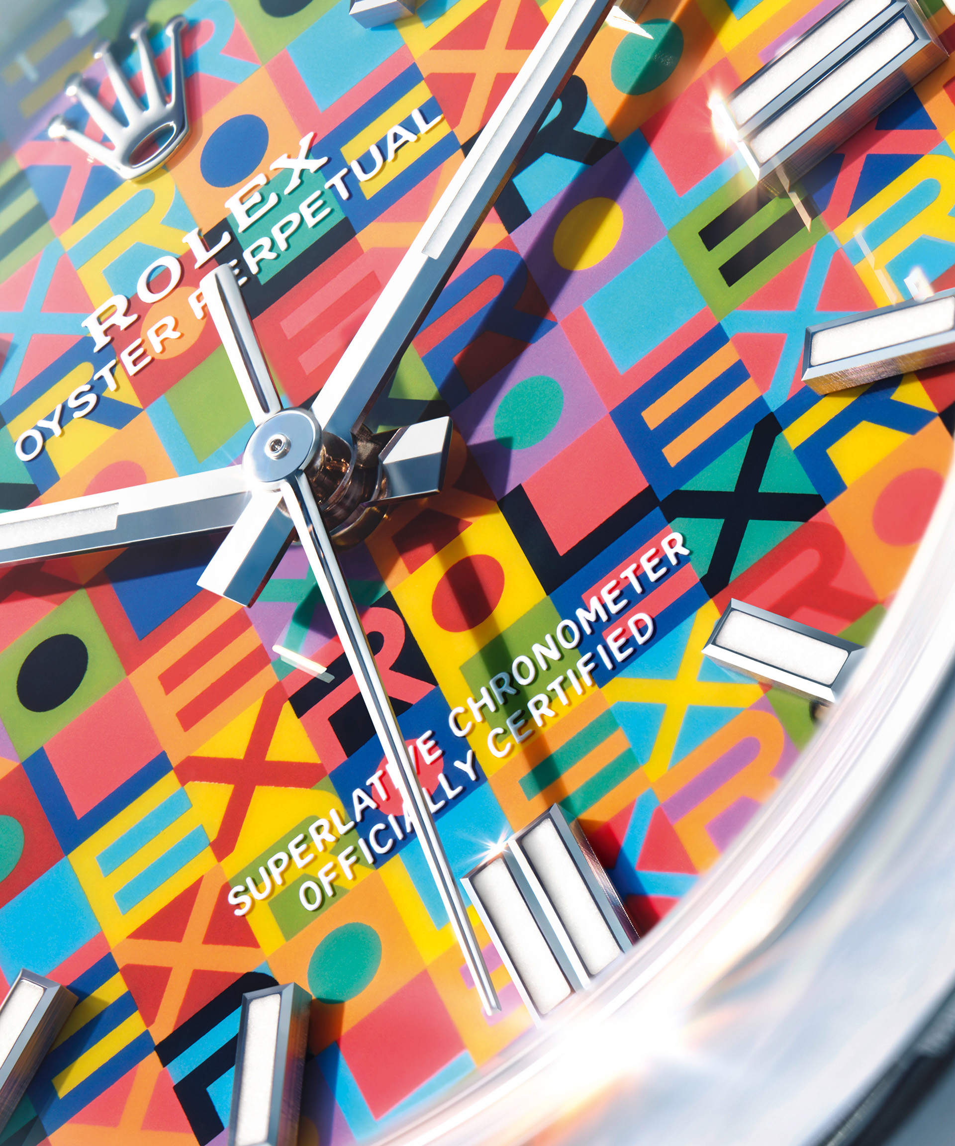 Das neue Jubilee-Motiv der Oyster Perpetual 36 ist dabei keine einfache Drucksache. Das Zifferblatt zeigt die fünf Buchstaben des Rolex-Namens als fröhlich-raffinierte Gesamtkomposition, deren Kontrast aus nicht weniger als zehn verschiedenen Lackfarben entsteht – und jede dieser Farben wird separat im Tampondruck aufgebracht. Das bedeutet: zehn Druckvorgänge, jedes Mal mit exakter Positionierung, um sicherzustellen, dass alle Formen und Buchstaben des Motivs perfekt aneinanderpassen.