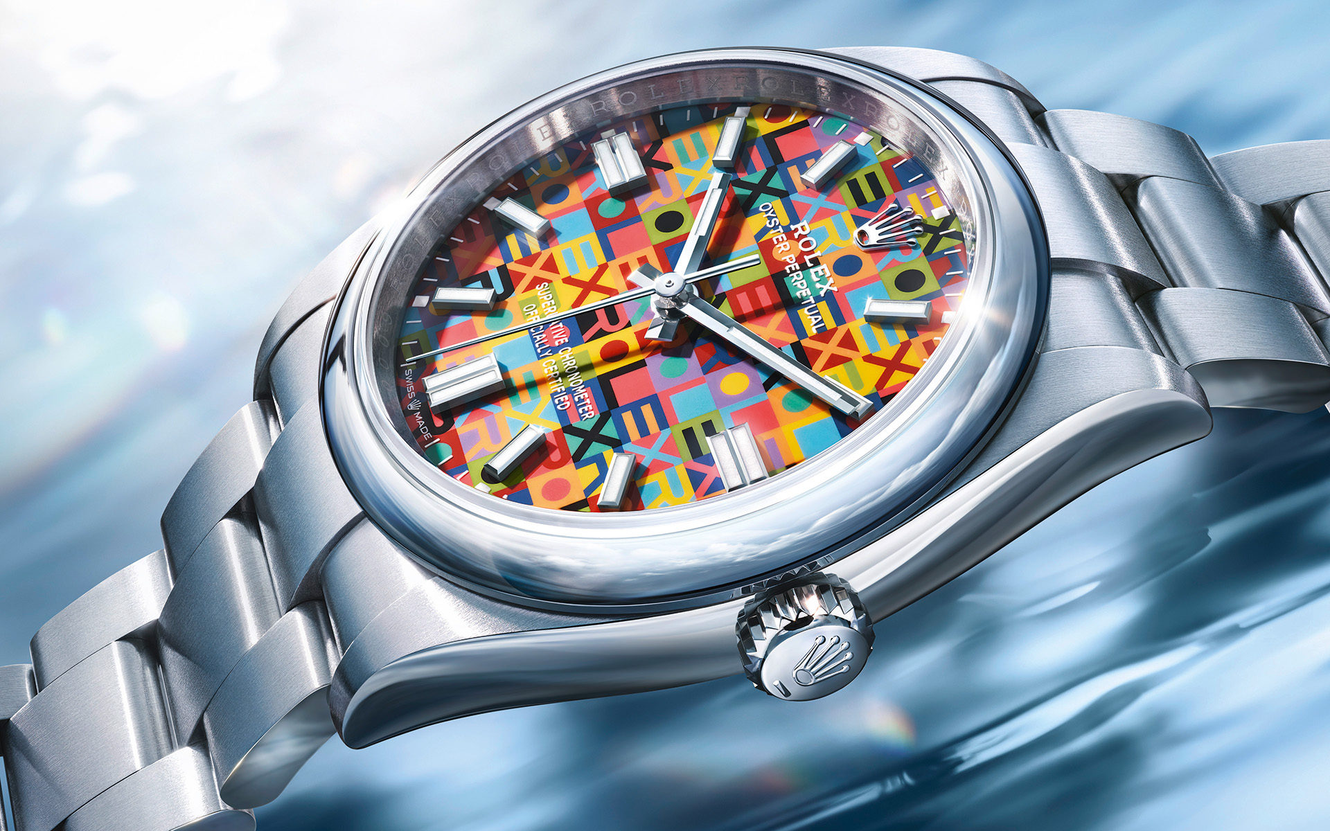 Mit der neuen „Oyster Perpetual 36“ greift Rolex ein grafisches Motiv auf, das die Marke in den späten 1970er Jahren eingeführt und über Jahrzehnte sporadisch reaktiviert hat: das Jubilee-Motiv. Im soeben vorgestellten Modell kommt es in seiner wohl farbenfreudigsten und handwerklich anspruchsvollsten Interpretation bisher – zehn Lackfarben, einzeln aufgetragen, die zusammen die Buchstaben R-O-L-E-X über das gesamte Zifferblatt verteilen.